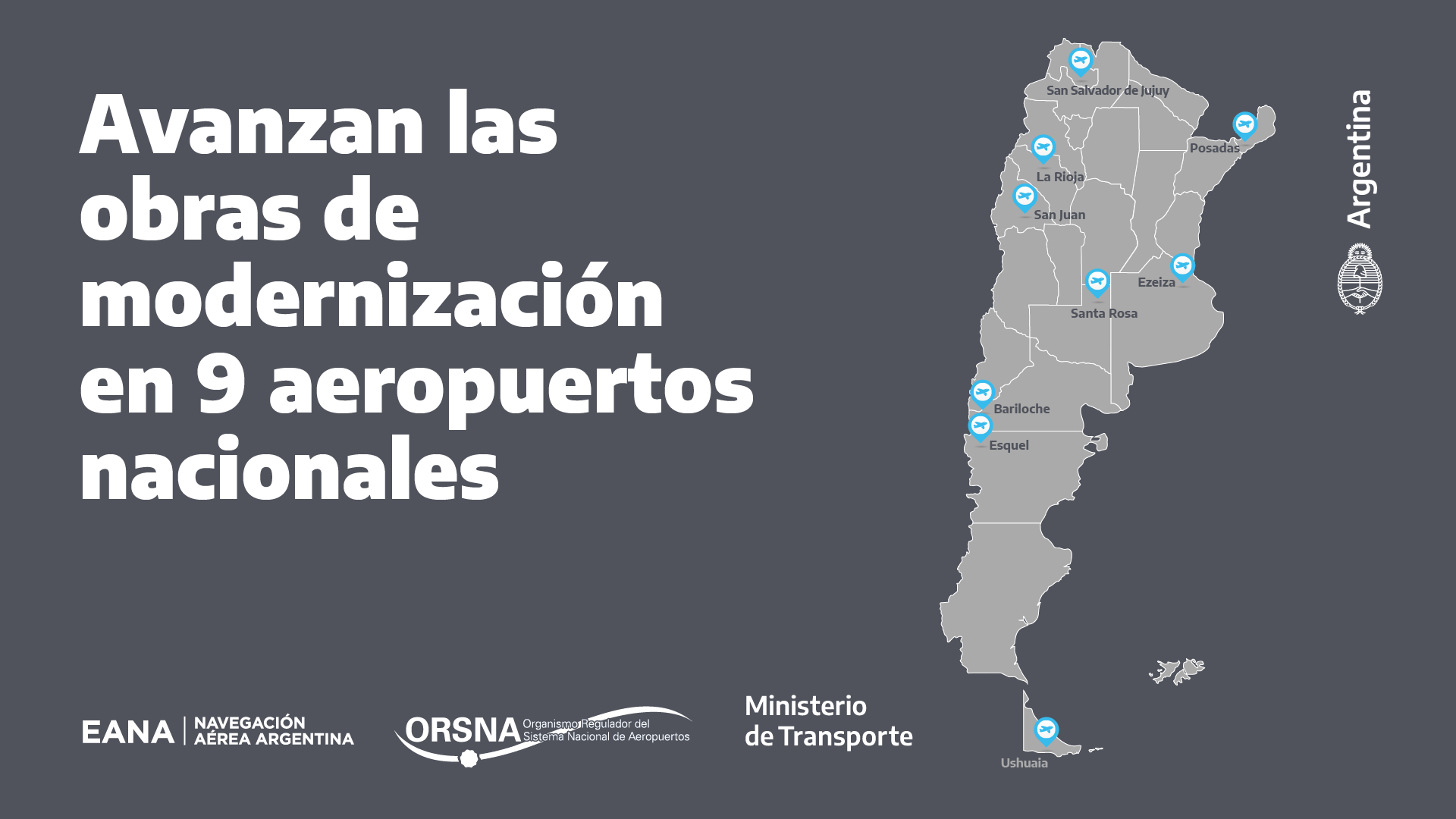 A partir de la ejecución de obras e implementación de mejoras al sistema de vigilancia de tránsito aéreo, el Ministerio de Transporte de la Nación informó que avanza el Plan de Modernización del Transporte Aéreo en los aeropuertos de Bariloche, Esquel, La Rioja, Ezeiza, San Juan, San Salvador de Jujuy, Santa Rosa, Posadas y Ushuaia.